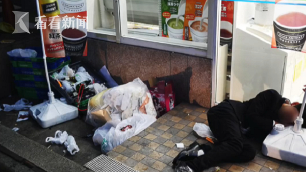 然而第二天早晨人群散去后,整条街都堆满了泡面碗、吸管、塑料袋、饮料瓶等垃圾,地面上还散落着不少烟蒂,垃圾桶旁更是堆成小山,与平日日本街道干净的形象截然不同。街边甚至还有许多宿醉的年轻人,由于第二天是工作日,不断有上班族们从他们身边经过,产生强烈对比冲突感。