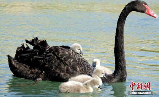 资料图:黑天鹅带领自己的宝宝们到湖中戏水。 刘学强 摄