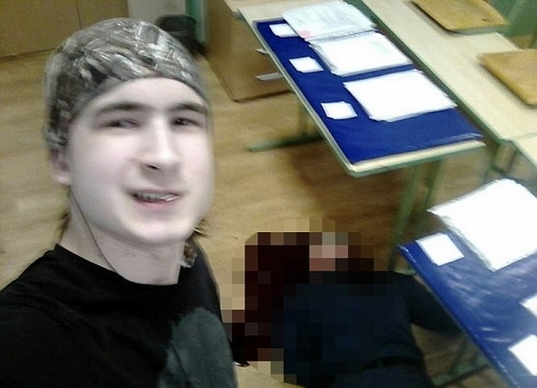 据俄罗斯独立电视台报道,这起谋杀案发生在课间休息时。安德烈从谢尔盖•丹尼洛夫(Sergei Danilov)背后用刀刺伤其脖子。随后,他发了几张自拍照,嘴里含着一根牙签,假装看上去很淡定。之后他便用电锯自杀了。画面中,被害者躺在血泊中。他曾是一名军官,是3个孩子的父亲,教授健康与安全课程。