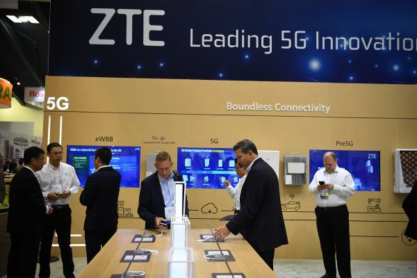 9月12日,在美国旧金山,人们在世界移动通信大会美洲展上的中兴公司展区参观。