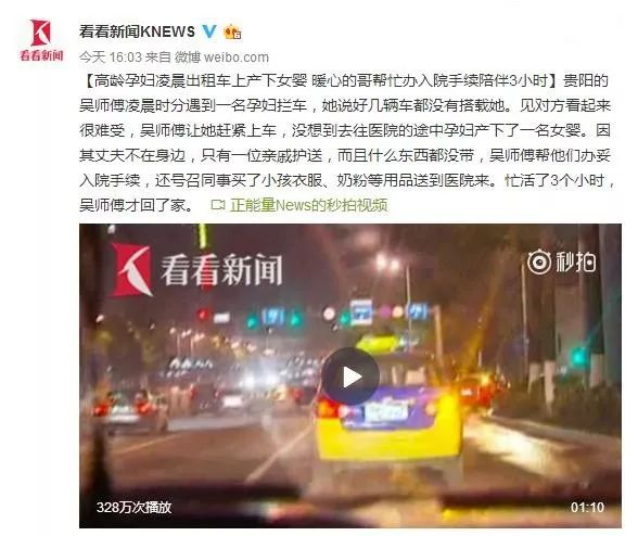 【高龄孕妇凌晨出租车上产下女婴 暖心的哥帮忙办入院手续陪伴3小时】贵阳的吴师傅凌晨时分遇到一名孕妇拦车,她说好几辆车都没有搭载她。见对方看起来很难受,吴师傅让她赶紧上车,没想到去往医院的途中孕妇产下了一名女婴。因其丈夫不在身边,只有一位亲戚护送,而且什么东西都没带,吴师傅帮他们办妥入院手续,还号召同事买了小孩衣服、奶粉等用品送到医院来。忙活了3个小时,吴师傅才回了家。