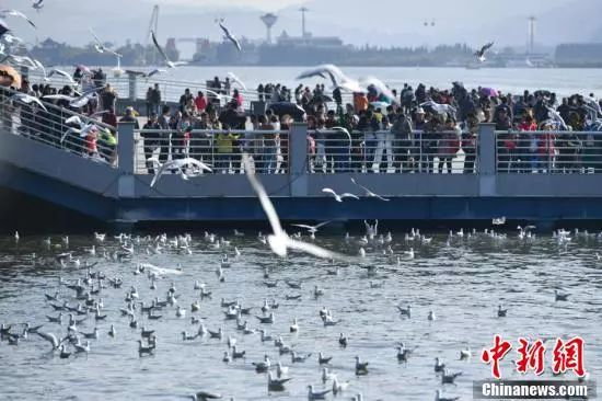 ▶昨日,近万只红嘴鸥抵达昆明滇池,吸引游客观赏喂食。据了解,每年冬季约有4万只红嘴鸥从西伯利亚来昆明滇池流域越冬。