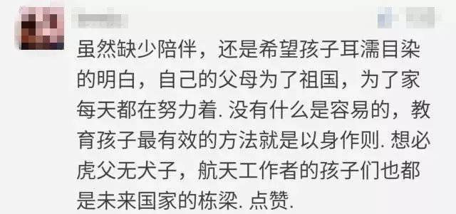 很多航天爸爸,手机里存的孩子的照片比妈妈还多,因为能和孩子相处的时间太少。航天的快节奏,让爸爸们失去了很多陪伴孩子的机会。但是一句“我爸爸是造火箭卫星的”,足以让孩子骄傲自豪。爸爸们的严谨、敬业,也是给孩子最好的启蒙教育。