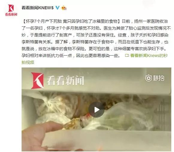 【怀孕7个月产下死胎 竟只因孕妇吃了冰箱里的食物】日前,扬州一家医院收治了一名孕妇,怀孕才7个多月就感觉不对劲。医生为其做了胎心监测后发现情况不妙,于是提前进行了剖宫产,可孩子还是没有保住。经查,孩子夭折和孕妇感染李斯特菌有关系。据了解,李斯特菌存在于食物中,而且在低温下也能生存,也就是说,放在冰箱中的食物不保险。更可怕的是,这种细菌专喜欢挑孕妇下手。孕妇相对来讲抵抗力低一点,因此也更容易感染一些。