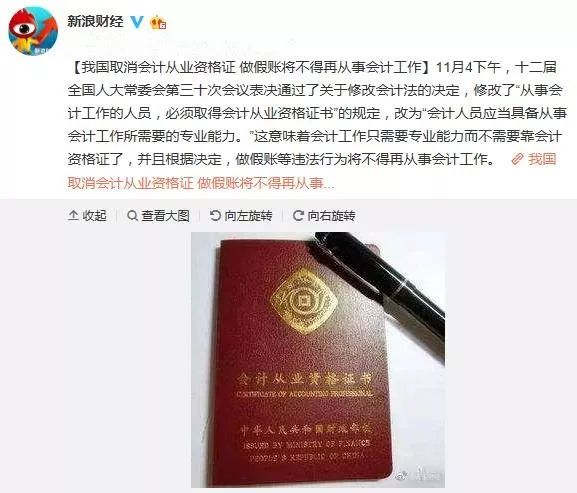 【我国取消会计从业资格证 做假账将不得再从事会计工作】11月4下午,十二届全国人大常委会第三十次会议表决通过了关于修改会计法的决定,修改了“从事会计工作的人员,必须取得会计从业资格证书”的规定,改为“会计人员应当具备从事会计工作所需要的专业能力。”这意味着会计工作只需要专业能力而不需要靠会计资格证了,并且根据决定,做假账等违法行为将不得再从事会计工作。
