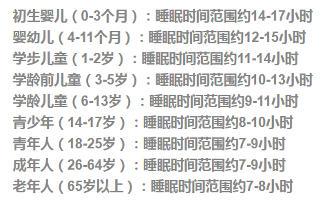 美国国家睡眠基金会(简称NSF)的专家们为了确定每个年龄段确切的睡眠时间,花了两年的时间出示了一套最新的针对人生不同阶段所需睡眠量的提议。如下图: