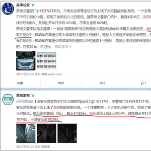 4月17日自海燕系统上线以来,9天时间江苏车主已经被抓拍开车打手机1074起,不系安全带1828起。