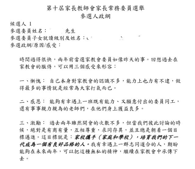这里记者也找到了一些参选人的资料/政纲,内容格式每个家教会各不相同,但对比下内地家长的“浮夸”包装,你会觉得香港家长似乎更“实在”一些。
