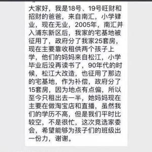 内地网上近日流传一些有关家长自荐参选学校家委会的对话截图,仔细看她们的自我介绍绝对傻眼,名牌大学毕业、私募基金公司任职、家里25套房... 为了获得家委会的席位,可谓是各种“浮夸”地自报家门。