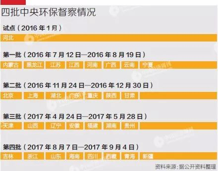 中央环保督察2016年1月在河北开展试点,至2017年8月,第四批中央环保督察已完成进驻四川、吉林等8省份。至此,从2016年到2017年两年的时间,中央环保督察完成了对全国所有省份的覆盖。