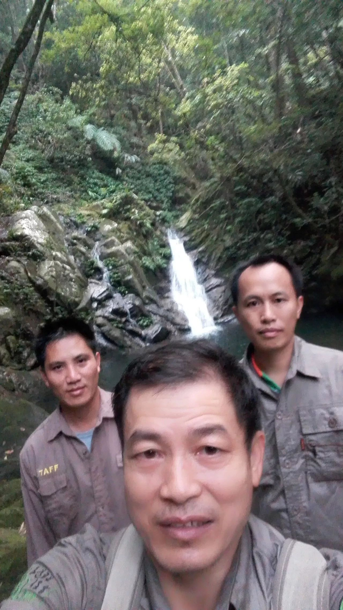 谢赠南等护林员在一条山间小瀑布前自拍。