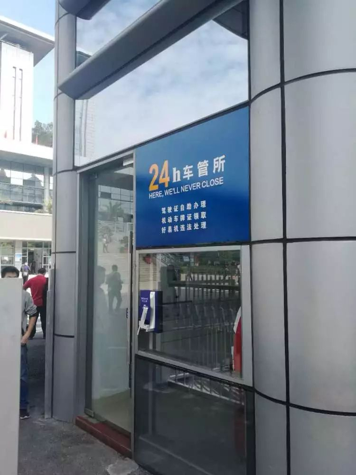 据悉,首个“24小时车管所”位于西丽车管所门口,服务点内配有“车驾宝”一体机、“蜂巢室”号牌存储柜,不仅能够自助办理补证换证类业务 ,还能够自助刷码取号牌,全天不下班。