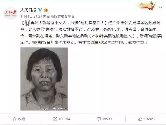 人民日报官方微博发布“梅姨”通缉信息,获10万网友转发。