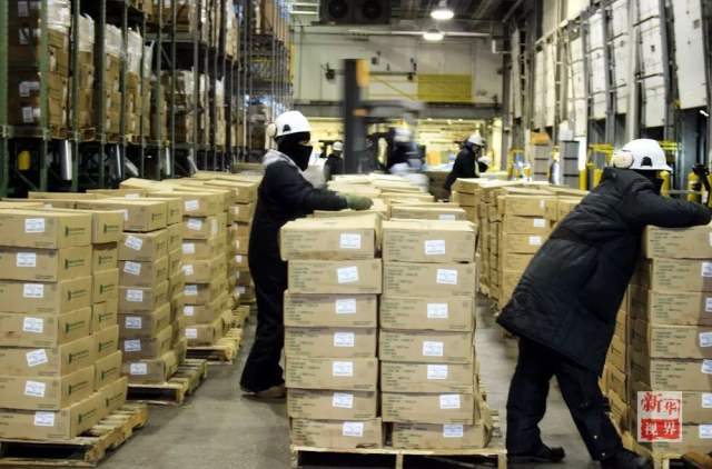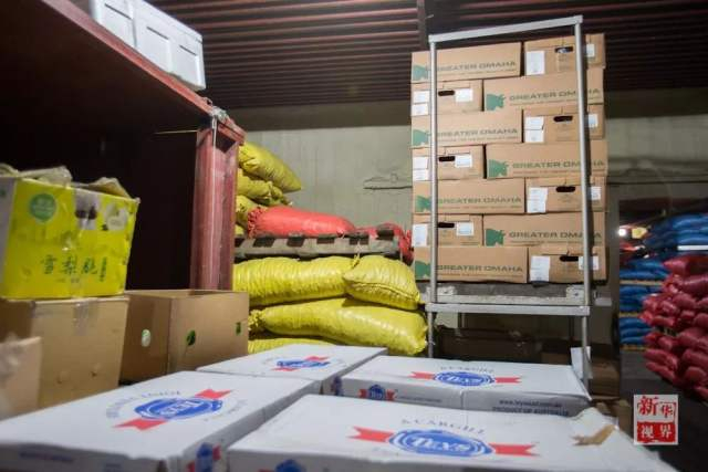 仓储区的工作人员码放牛肉包装箱。