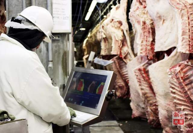 质检人员用机器检测牛肉品质并评定等级。