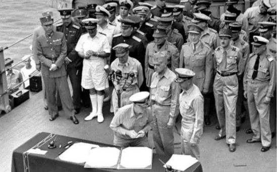 1945年9月2日,日本东京湾,日本投降签字仪式在美国海军“密苏里”号战列舰上举行。