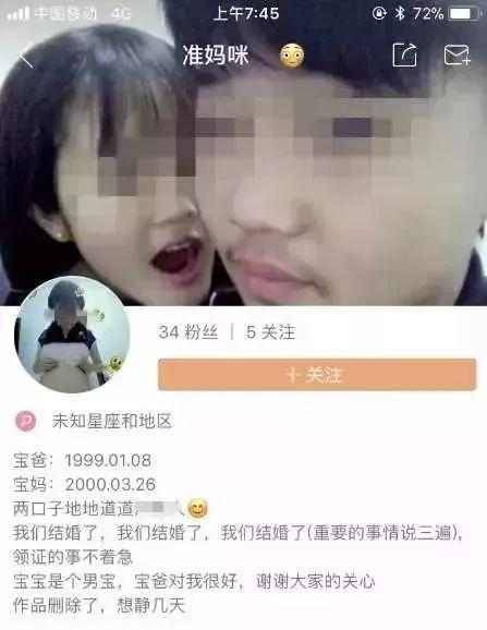 还有另一位“准妈妈”,称自己是2000年出生,今年17岁,老公1999年出生,今年18岁。而她15岁就和宝爸“结婚”,但是年龄不够没有领结婚证。