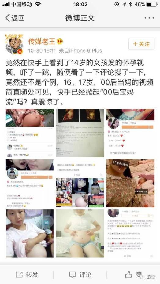 10月30日,微博用户“传媒老王”发布微博称,“在快手上看到了14岁女孩发的怀孕视频,并配有多张视频截图。还不是个例,快手掀起了00后宝妈流”,从14岁到17岁不等,大多是念初中时怀孕辍学,靠在平台上发布孕期视频和母子互动成为网红,动辄吸引上万粉丝。这些宝妈并不像新闻里的早孕妈妈那样惊慌失措,相反,她们以此为荣,小小年纪就成了妈妈,似乎更早一步成为人生赢家。