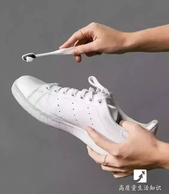 打湿鞋子后,在鞋子表面涂上一层牙膏,然后用软毛刷打圈圈刷洗,同样静置5分钟后,再用清水冲干净,你会发现污渍不见,鞋子亮白如新~