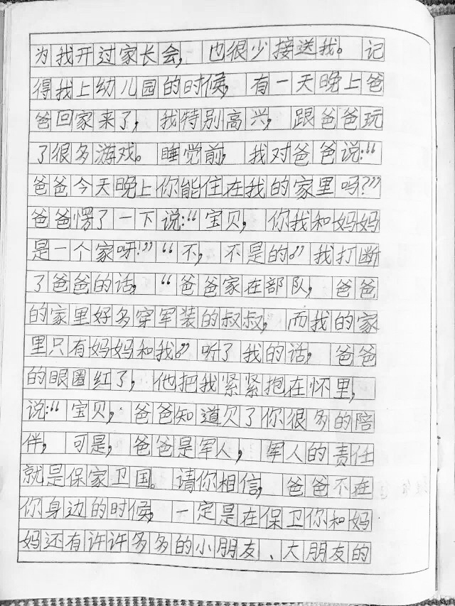 虽然很羡慕别的小朋友能和爸爸一起玩。但是:现在她越来越理解爸爸了,理解了爸爸作为军人的责任与荣誉!