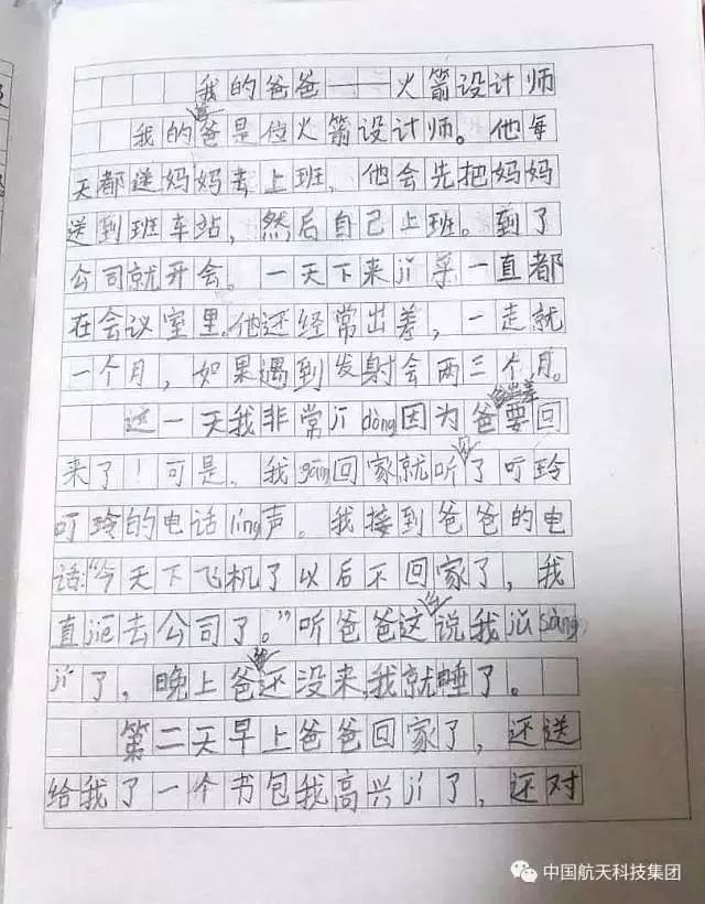 除此之外,另一篇三年级小学生的作文《我的爸爸——火箭设计师》也在朋友圈刷屏了。小朋友写道:爸爸工作非常劳累,还很敬业,很少有时间陪我,希望爸爸能多陪陪我。