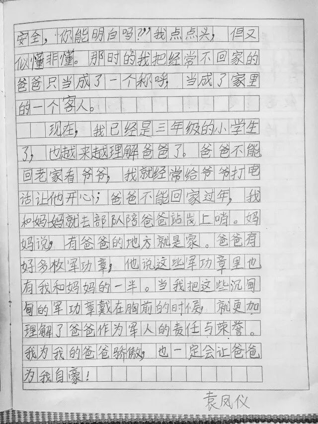 这篇作文是三年级小学生袁凤仪写的。正如作文中,袁凤仪小朋友写道的,爸爸曾对她这样说:“爸爸不在你身边的时候,一定是在保卫你和妈妈还有许许多多小朋友、大朋友的安全!”