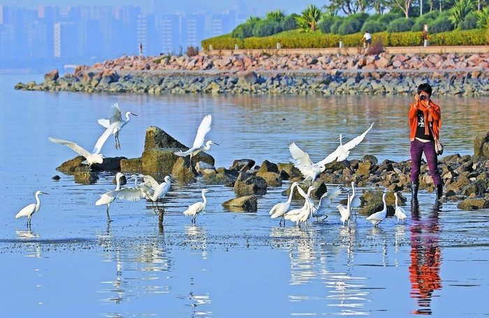 爱鸟市民在深圳湾观鸟(图中鸟为小白鹭)