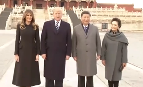 国家主席习近平和夫人彭丽媛8日下午与来华进行国事访问的美国总统特朗普和夫人梅拉尼娅共同参观故宫前三殿。