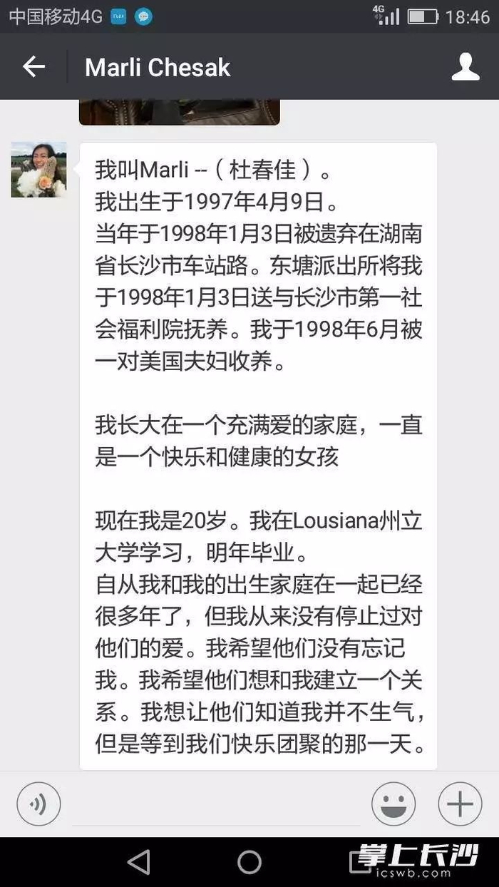 “毕业后我一定要来长沙寻找父母。”杜春佳告诉记者,为了回来寻亲方便,自己跟着来美国读书的中国同学学会了中文,还注册了微信号。