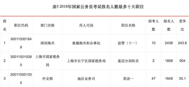 仅从报考人数来看,截至11月6日16:00,深圳海关隶属海关和办事处监管一职,继续“霸占”报名人数最多职位的“头把交椅”岿然不动,报名人数达到2438人。上海市长宁区国家税务局基层分局科员岗位,报考人数为1808人位列第二。外交部地区业务司英语一岗位昨日报名人数达到1649人,挤进前三。