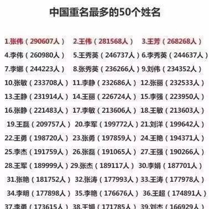 近日,一篇“中国最常见名字前50名”的文章依次排列了中国重名最多的50个姓名,前十名分别是: