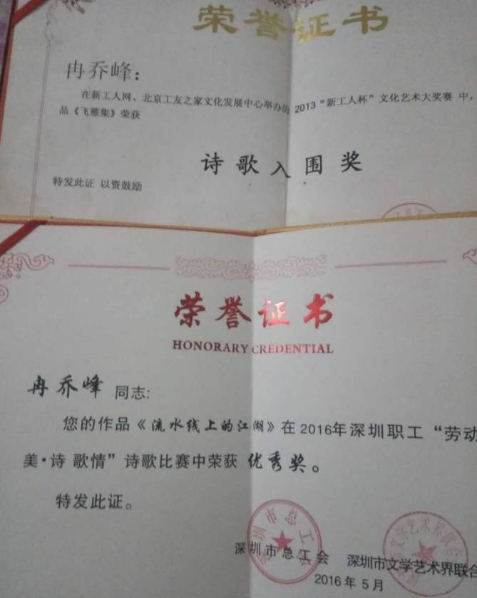 2013年,他的一首诗参加在北京举办的“新工人杯”文化艺术大赛,获得了入围奖,这是他的诗作第一次受到专业的肯定,也激励了他继续写下去。几年下来,写了近300首诗,诗作发表在多种刊物上。2016年,他的诗再次获奖。