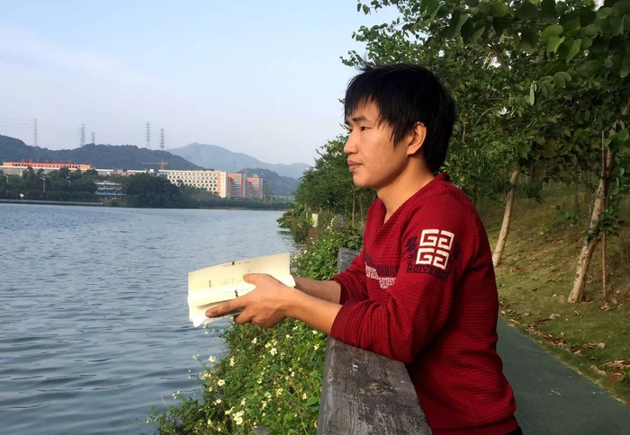 工作之余,冉乔峰时常会一个人在湖边读诗。 李凌 摄
