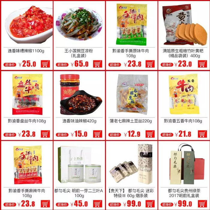 此外,还有老干妈、修文猕猴桃果、息烽阳朗辣子鸡、奇绝油卤的鸭脖一齐上阵,喜欢贵阳的美食的吃货们,还不快快入手?
