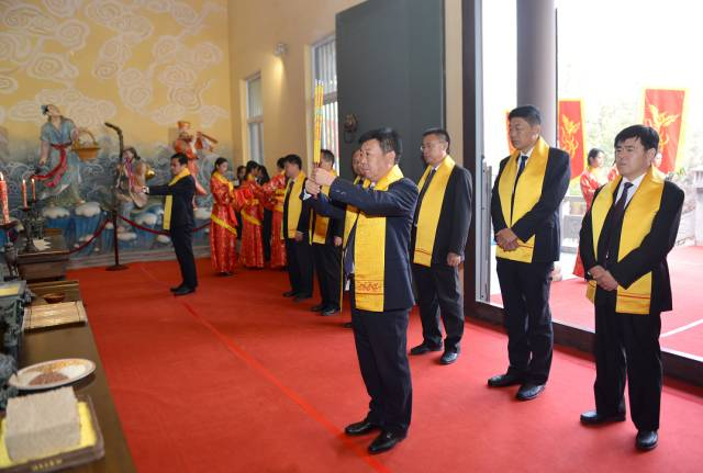 “击鼓九通,鸣金九响,歌舞告祭”,在演绎舜帝九五至尊的声乐中,主祭景芝酒业董事长刘全平,率公司常务副总经理来安贵,副总经理赵德义登上酒祖大殿,经洗尘礼、沃盥礼、熏香礼后,向大舜酒祖、仪狄、杜康奉香献馨,恭行敬礼。