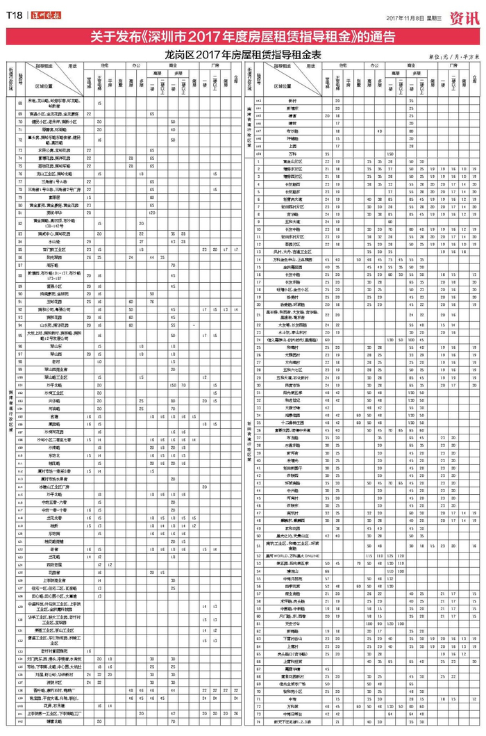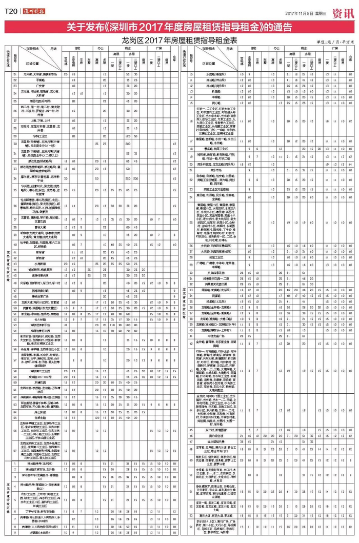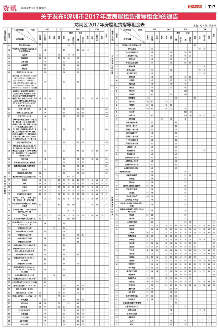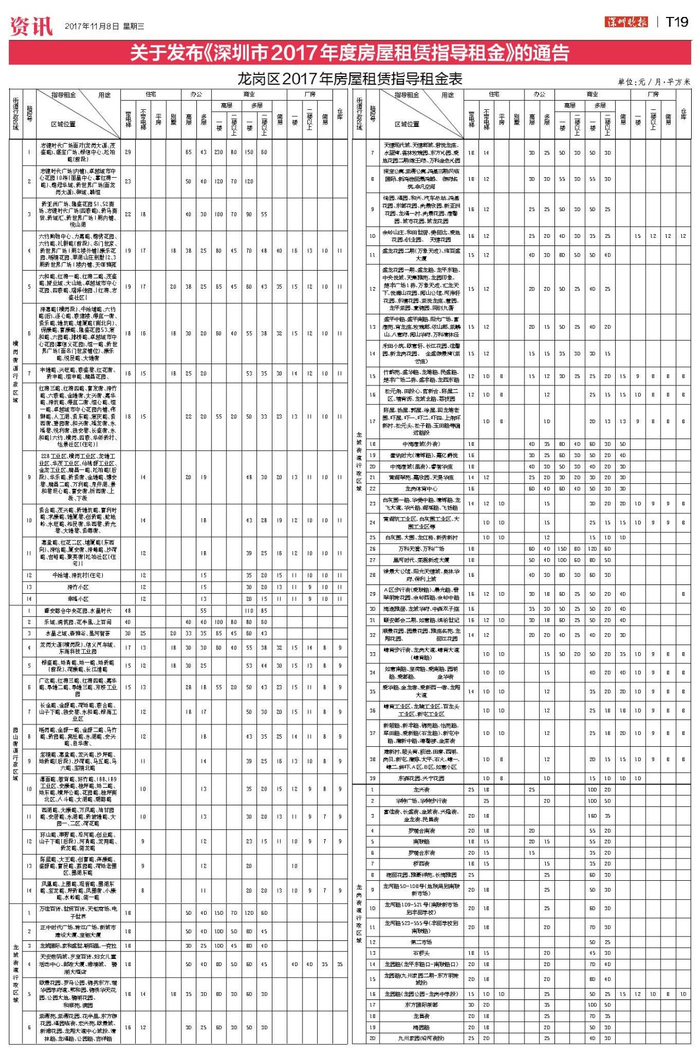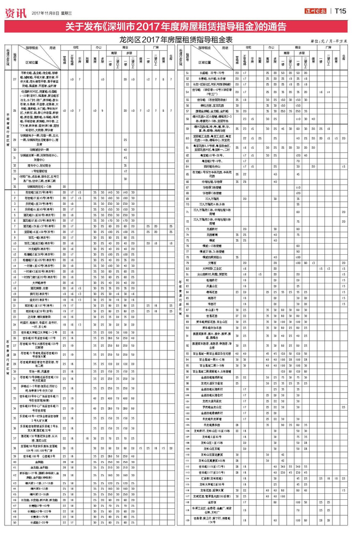 龙岗区、龙华区2017年房屋租赁指导租金表