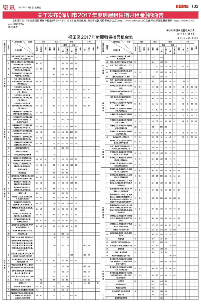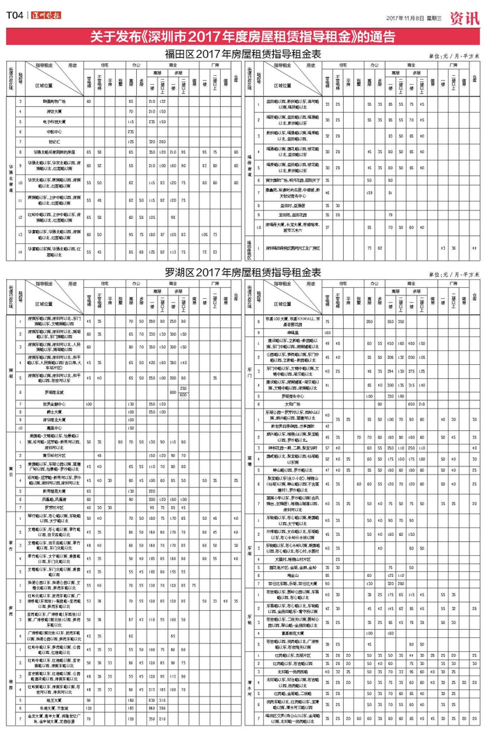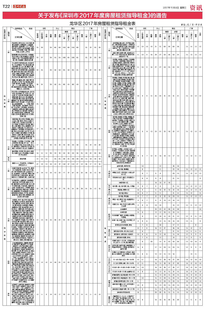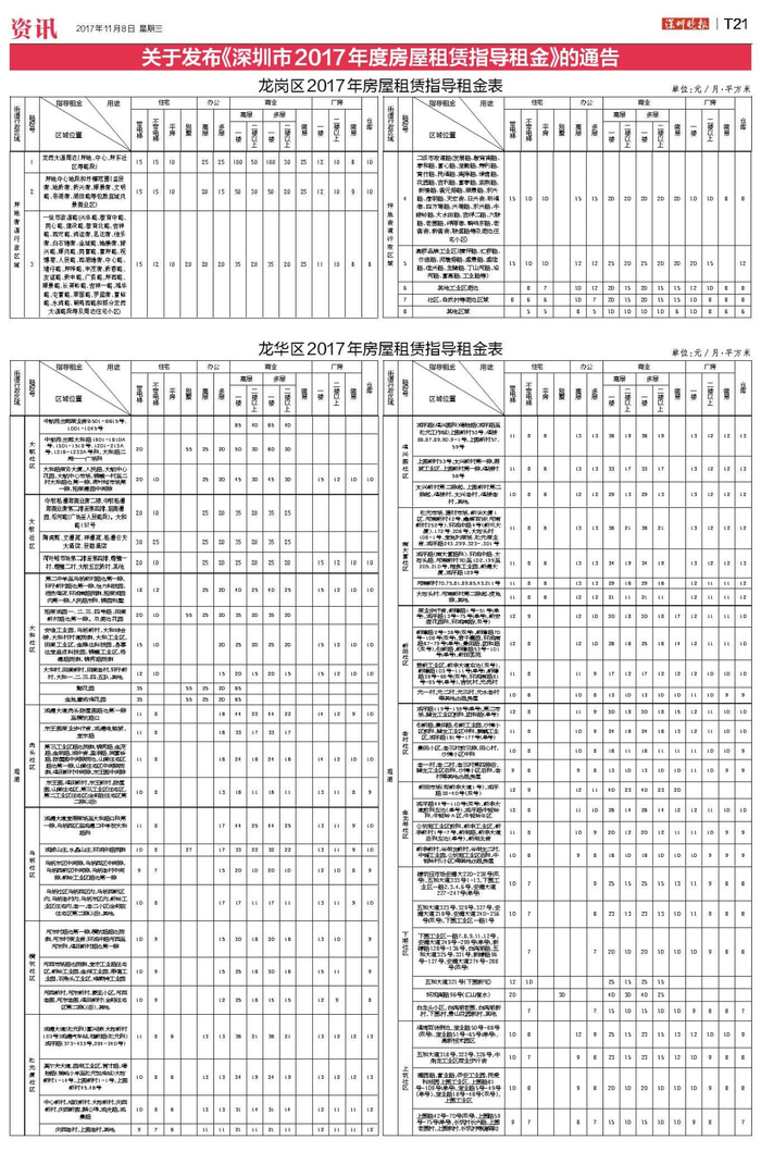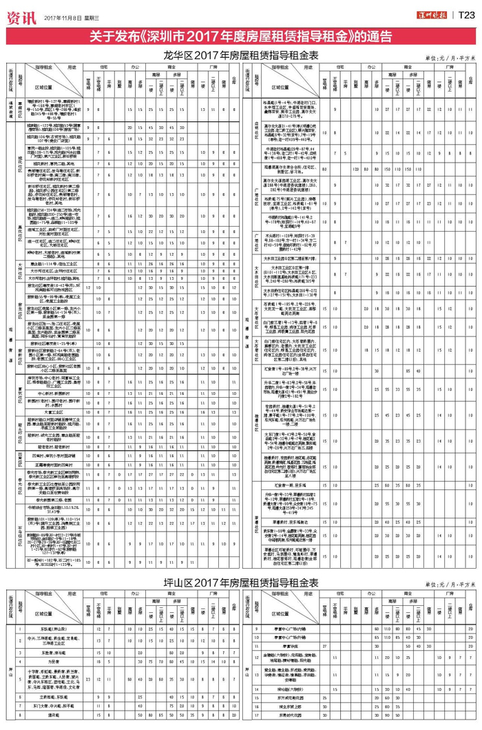 龙岗区、龙华区2017年房屋租赁指导租金表
