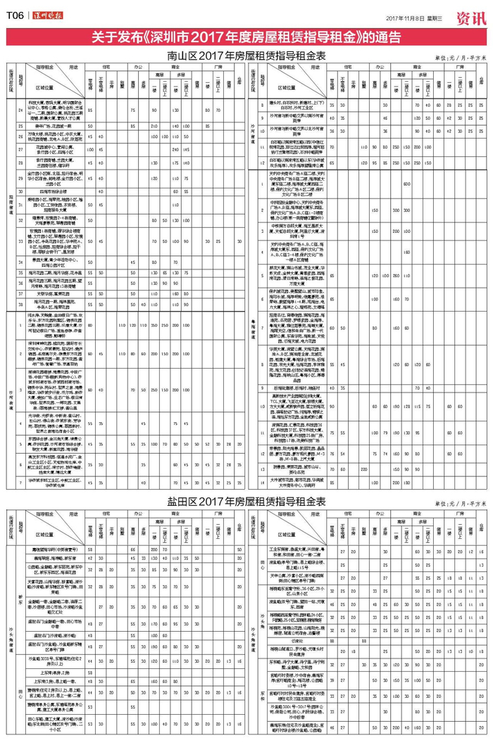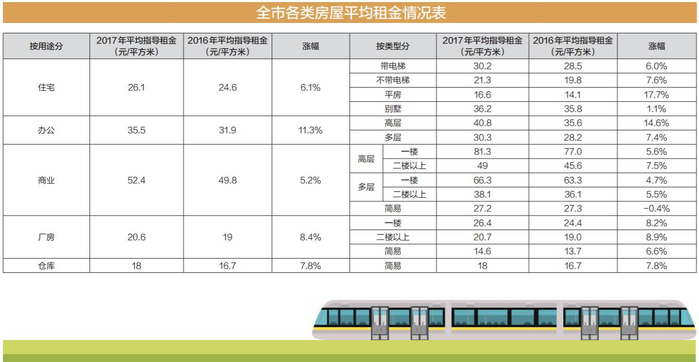根据《租金表》,2017年深圳各类用途房屋租金明显上升,住宅类房屋整体平均租赁价格涨幅达6.1%,办公类房屋整体平均租赁价格涨幅达11.3%。