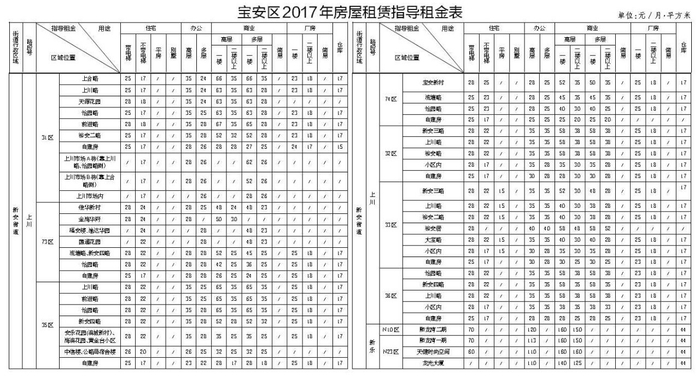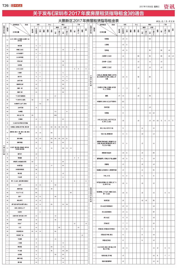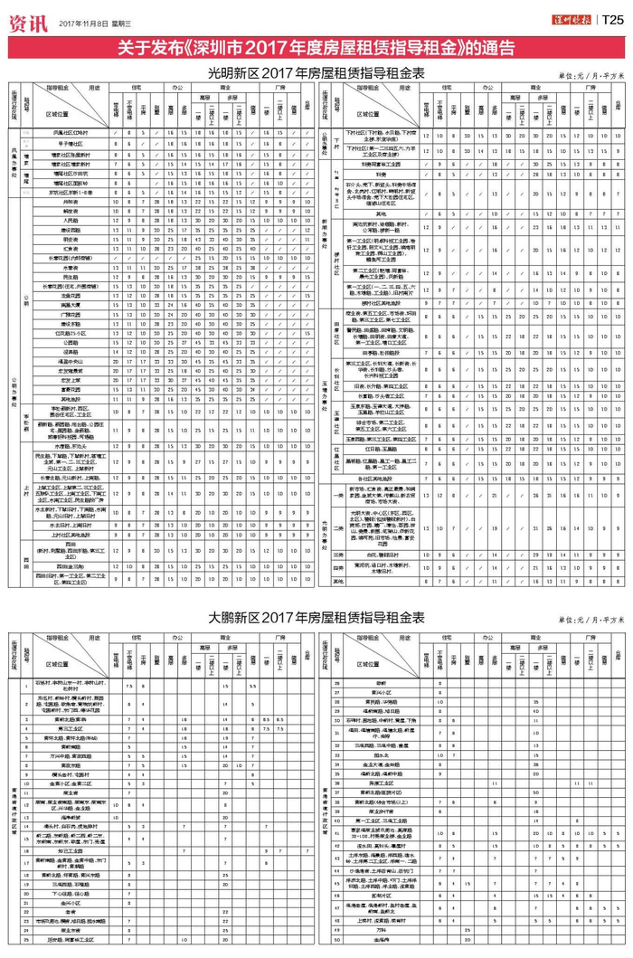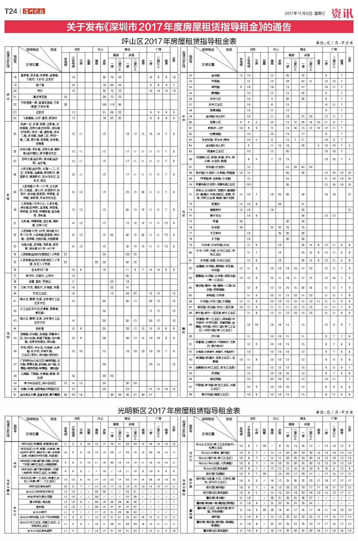 坪山区、光明新区、大鹏新区2017年房屋租赁指导租金表