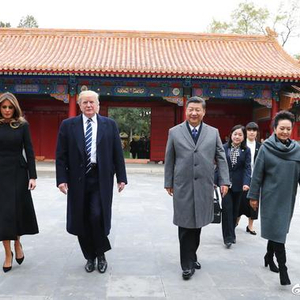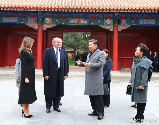#领航中国#[习近平和夫人彭丽媛同美国总统特朗普和夫人梅拉尼娅茶叙]国家主席习近平和夫人彭丽媛8日下午在故宫博物院迎接来华进行国事访问的美国总统特朗普和夫人梅拉尼娅。两国元首夫妇在宝蕴楼简短茶叙。