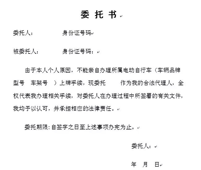 2、车辆所有人的身份证明(无户籍限制,不需提供居住证或居住证明文件),代办人还需要提供委托书(式样如下)及代办人身份证明;