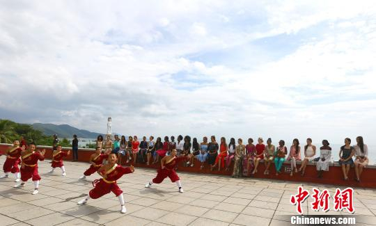 11月8日,世界小姐佳丽在三亚南山寺观海平台欣赏小武僧表演功夫套路。 陈文武 摄