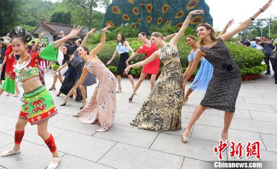 11月8日,世界小姐佳丽在三亚南山景区感受黎族风情舞蹈。 陈文武 摄