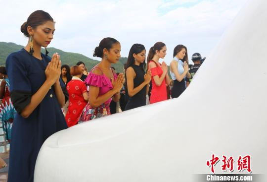 11月8日,世界小姐佳丽在三亚南山海上观音脚下祈福。 陈文武 摄