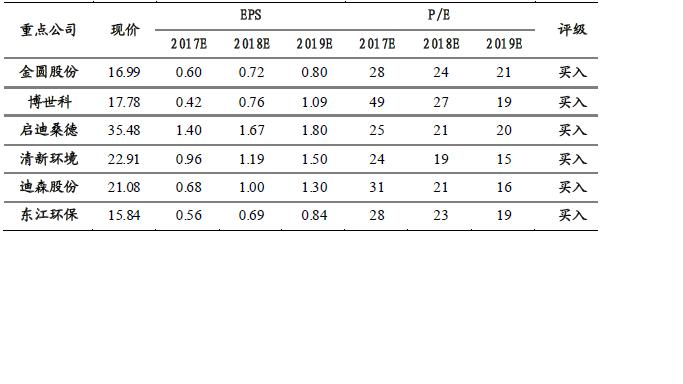 东北证券建议关注在污水治理方面具有核心技术以及竞争力的博世科(300422.SZ);固废问题中较为突出的是危废,环保督察后原有产生危废的厂商不敢将危废堆放在厂区,危废处理设备利用率提升,建议关注水泥窑协同处置龙头金圆股份(000546.SZ);煤改气是贯穿今年下半年的主题之一,随着“大气十条”考核临近以及京津冀大气督查的持续推进,行业有望持续受益,建议关注壁挂炉龙头迪森股份(300335.SZ)。除此以外,东北证券还提供了重点公司情况: