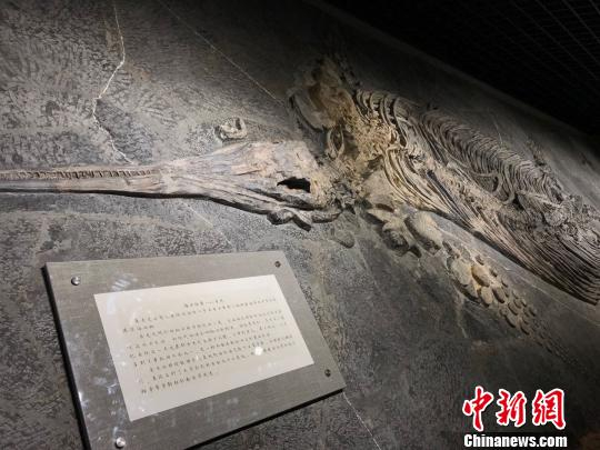 在千岛湖自然博物馆展出的两千五百万前的鱼龙化石。 张斌 摄