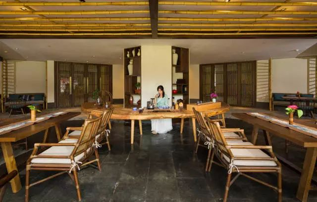 还可以在中国风十足的餐厅用餐,沉稳的藏蓝色和典雅的金棕色让整个用餐氛围一下up!