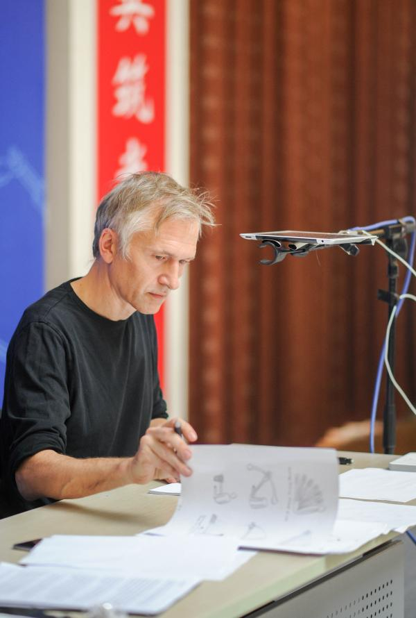 有趣的是,在展开学术演讲的同时,还有两位艺术家“介入”其中。常驻柏林的插图画家、平面设计师安德鲁斯•滔普夫此次在阿尔曼•阿瓦尼斯安发言现场,以即兴插画创作的形式展现了哲学思考在视觉维度上的再阐释。而常驻上海的声音艺术家殷漪则在活动现场以声音为媒介,通过环境空间、视觉、触觉和声道等同时展开的多个渠道,用声音艺术呈现对于“时间”的认知与阐释。