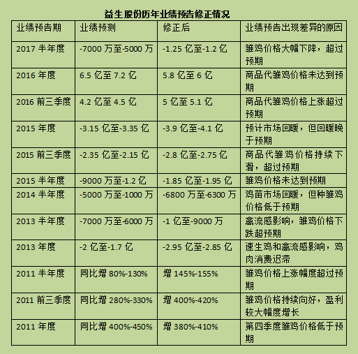 比鸡更捉摸不透的,是益生股份的业绩预告。自2010年上市以来,公司定期业绩预告已修正了12次,业绩预测几乎就没太准确过。