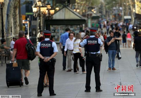 资料图:当地时间8月18日,西班牙巴塞罗那兰布拉大街,恐袭发生后警方加强巡逻安保。
